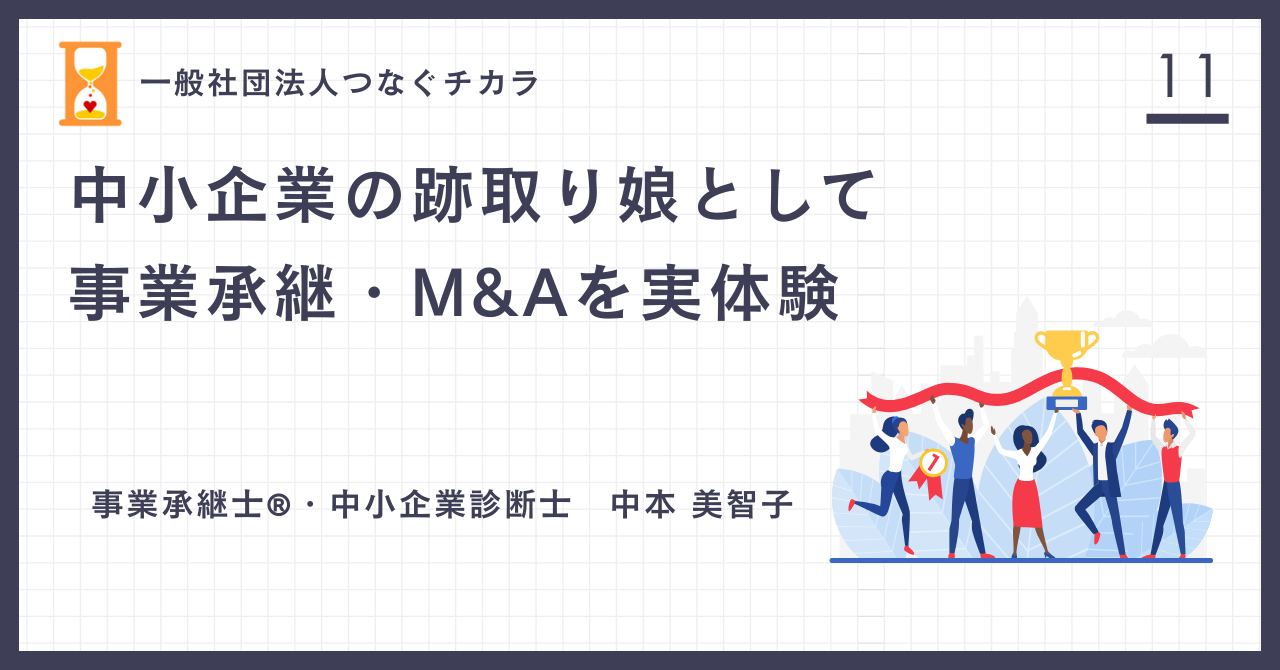 私は中小企業診断士の資格を取得後、父の創業した中小企業の跡取り娘として事業承継・M&Aを経験しました。この経験から「経営者の伴走者になりたい」と考えています。ここでは、私自身が歩んできた道のりを少しお話しします。