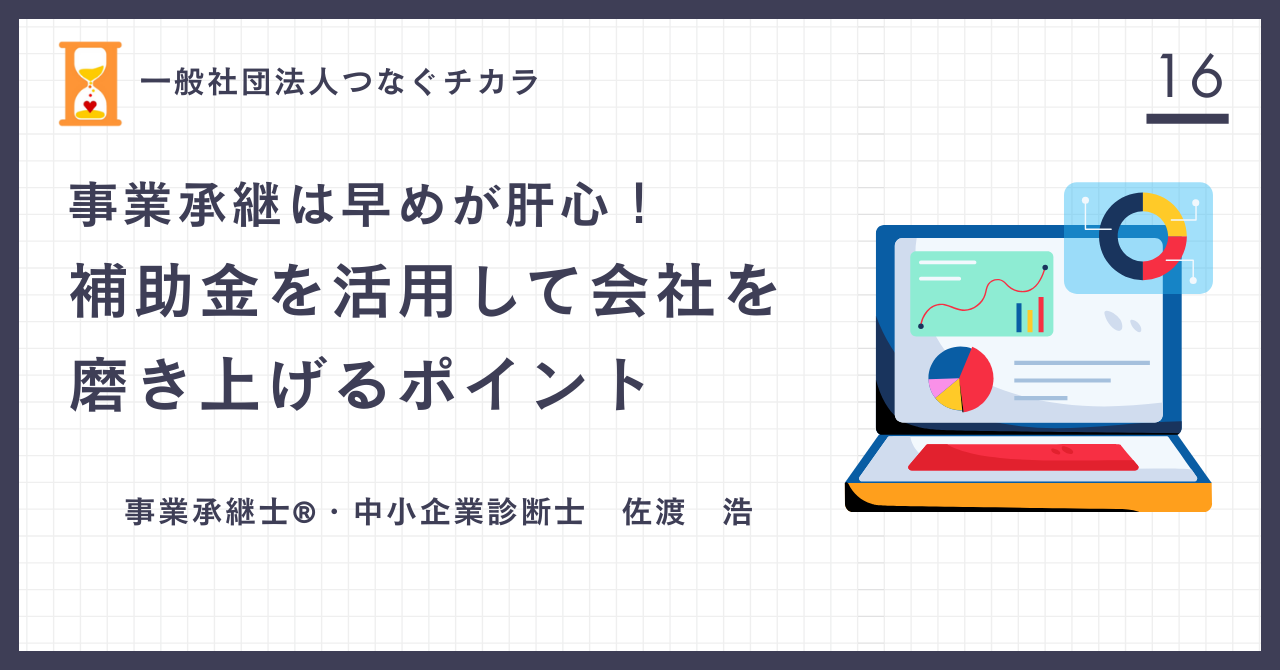 みなさん、自社の事業承継についてお悩みではないでしょうか?つい先延ばしにしがちな事業承継ですが、様々な点から早期に取り組むことが重要です。特に、事業承継のタイミングで補助金や助成金を活用して自社を磨き上げることを検討する場合は計画的な準備が必要です。